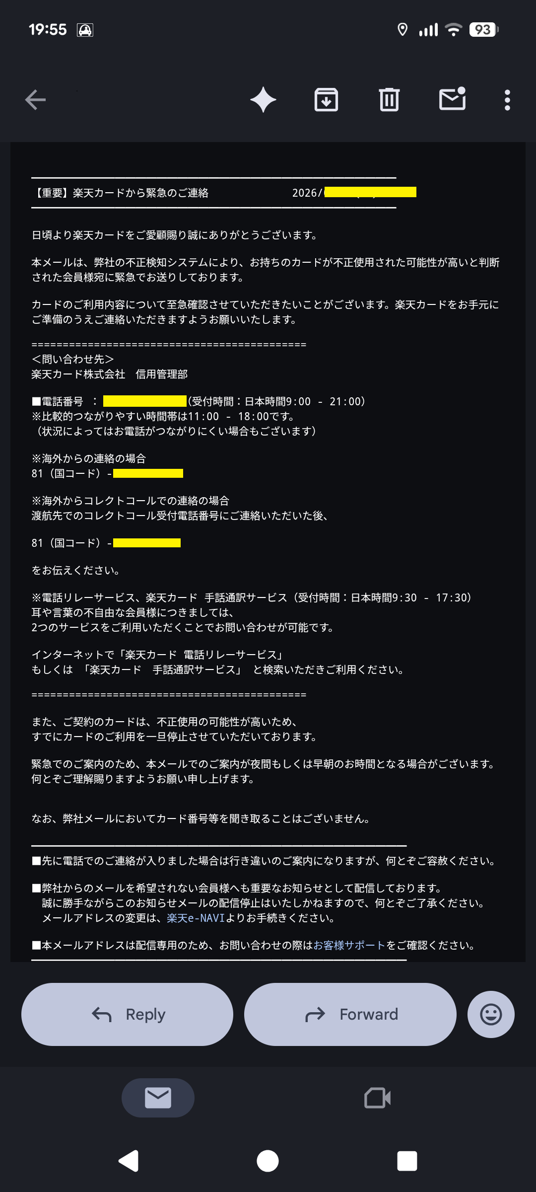まず考えたのは、このメール自体が何かしらのフィッシング詐欺ではないかということでした。 しかし、メールに記載されている楽天カードの電話番号を調べてみると、確かに正しい電話番号であるようです。