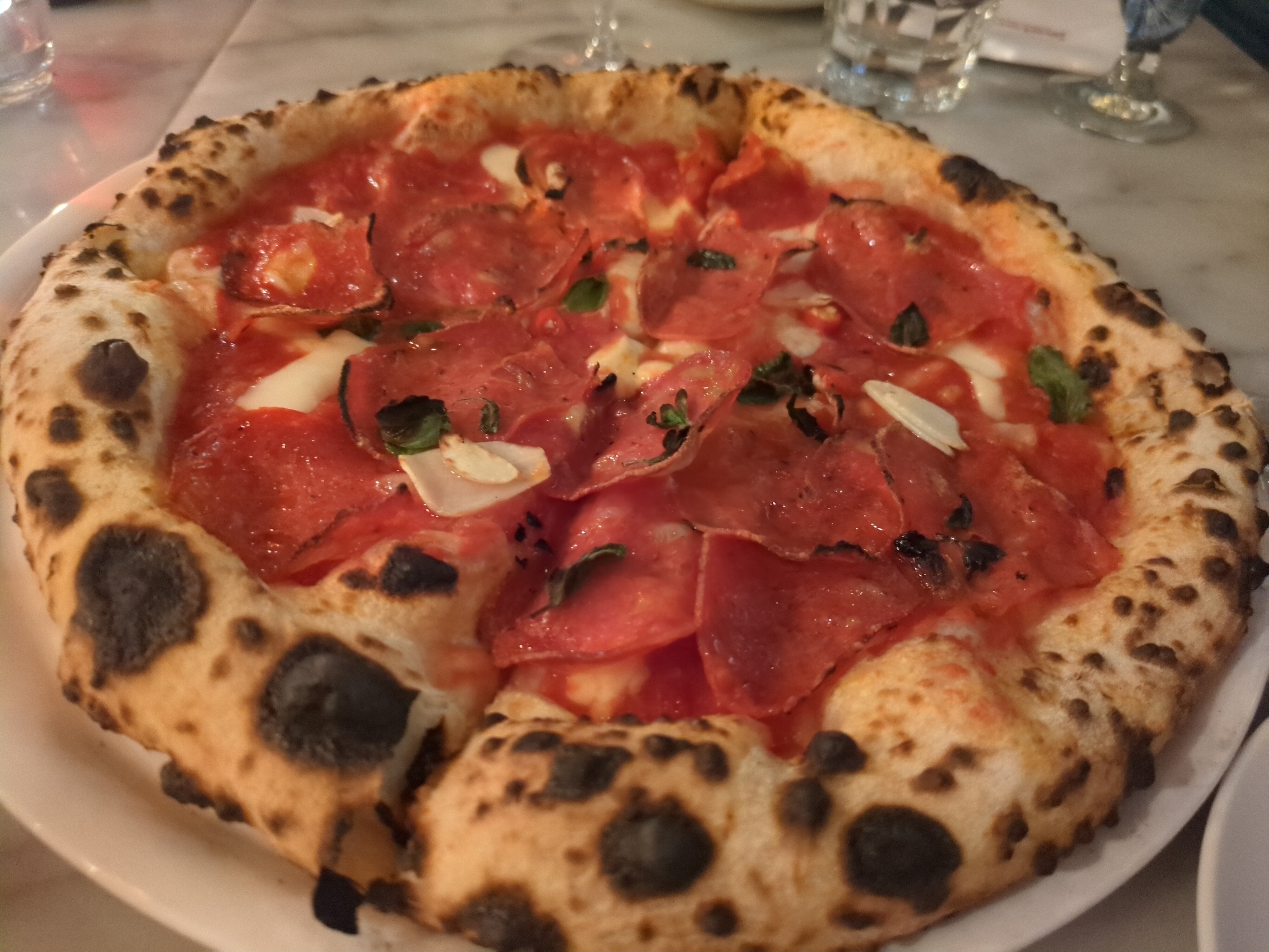 日本ではドミノピザとかのチェーン店のピザのほかは、レストランでピザを食べたことはあまりないので特に舌が肥えているわけではないのですが、ピザ窯で焼かれた本格的なピザで本当に美味しかったです。 生地が薄いのですがしっかりしていて破れることがなく、耳の部分まで柔らかく食べられました。